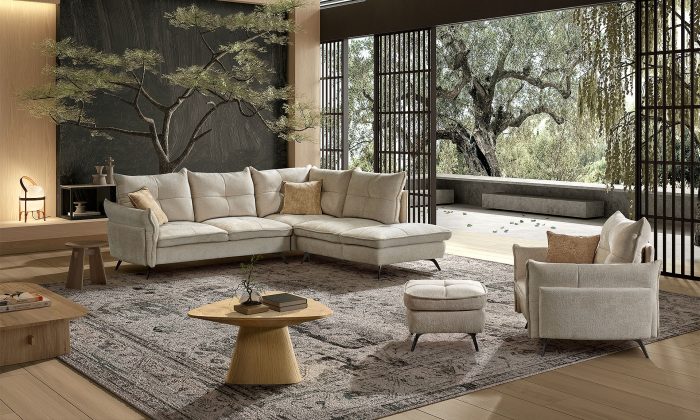 Un salon présentant un canapé d'angle. Le canapé est habillé d'un tissu gris clair et dispose de 5 places assises.