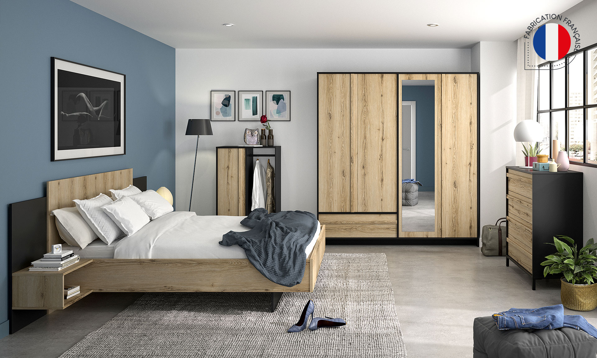 Corps et façades panneaux de particules revêtus papier imitation chêne Helvezia et uni noir. Verre clair argenté pour miroir armoire. Poignées panneaux de fibres moyenne densité enrobés papier imitation chêne Helvezia. Caisse de tiroirs panneaux de particules revêtus polypropylène noir sur coulisses à galets. Pieds ABS noir mat.